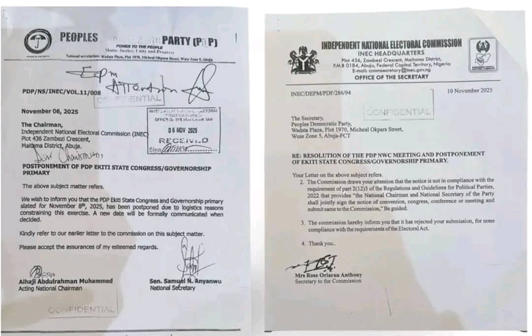INEC has categorically rejected a spurious letter from expelled claimants of Acting National Chairman of the Party, Mohammed Abdulrahman and Samuel Anyanwu, who sought to unlawfully postpone the Ekiti State gubernatorial primaries, thereby safeguarding the electoral timeline and exposing the duo’s desperate bid to sabotage Nigeria’s opposition vanguard.