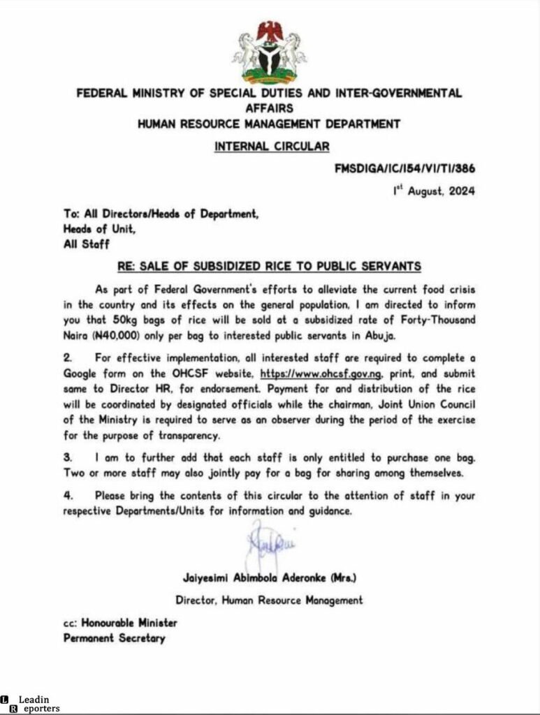 The Federal Government of Nigeria has reportedly begun the sale of bags of rice worth forty thousands naira to only public servants in the Federal Capital Territory.