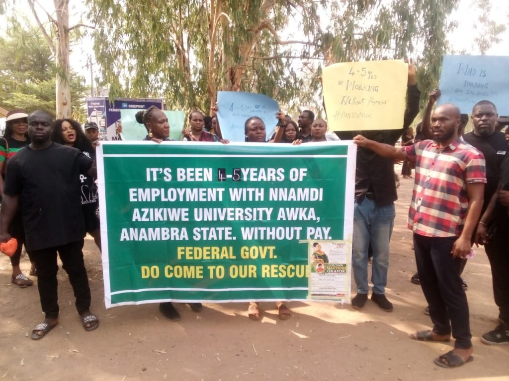 Approximately 1,000 lecturers at Nnamdi Azikiwe University, Awka (UNIZIK) have staged a protest over the non-payment of their salaries since their employment in 2019.