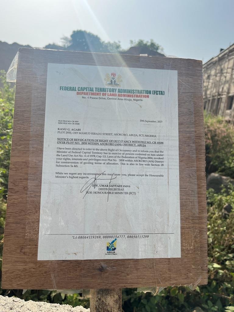 This was contained in a notice of revocation pasted on the property located at Plot 2935, off Mamud Ribadu Street, Asokoro, Abuja.